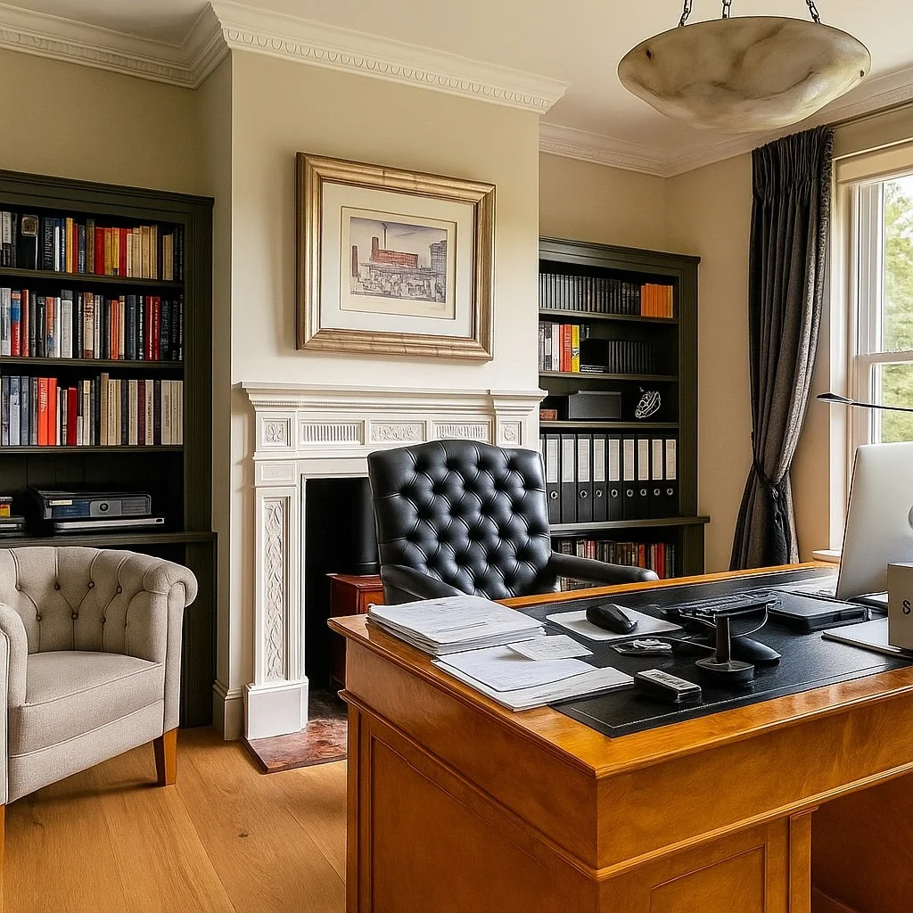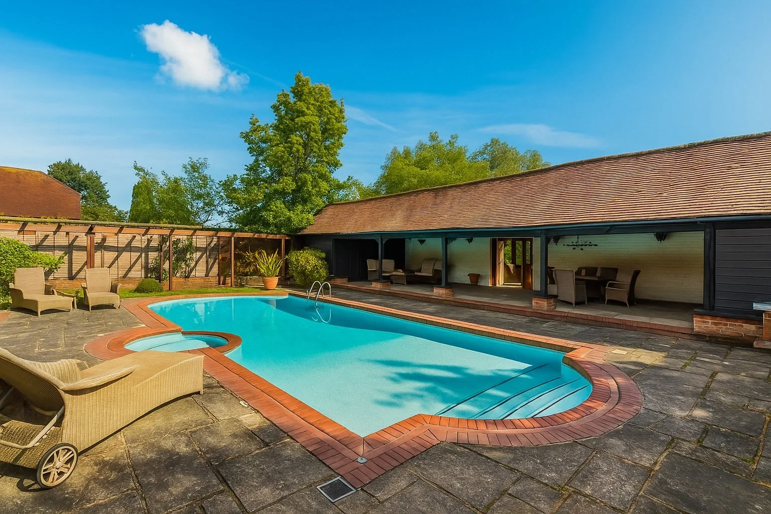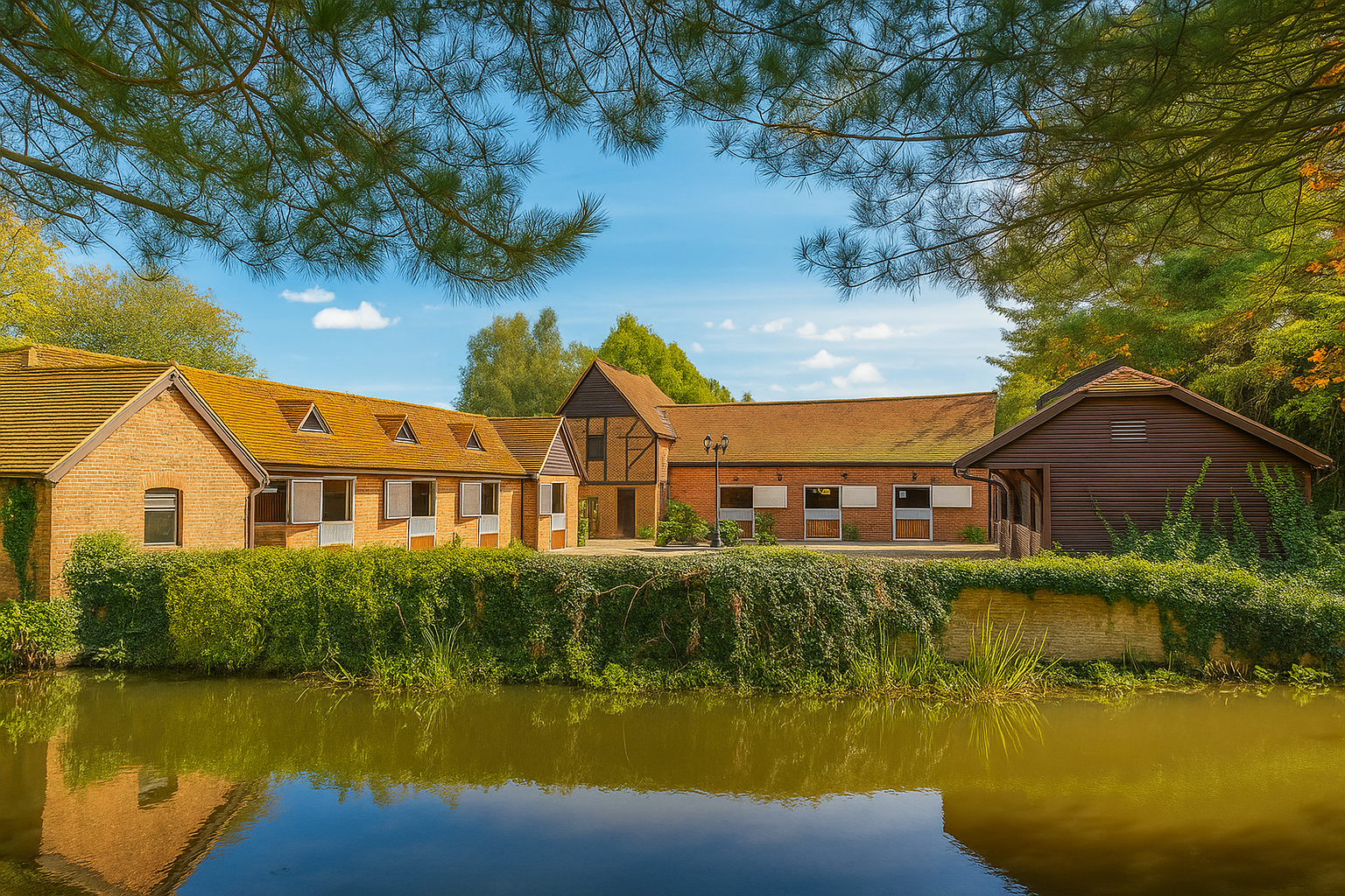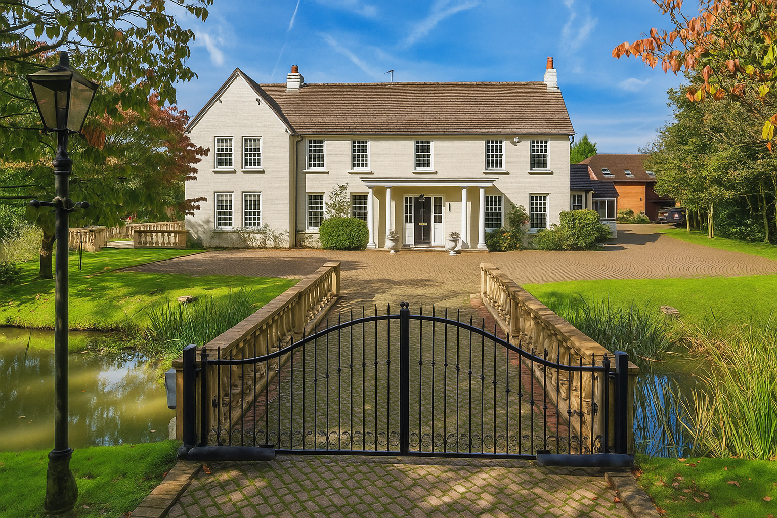 The Moat House is a comprehensively redeveloped country residence set within a tranquil, moated site, designed to accommodate both family life and leisure. The main house has been extensively remodelled, introducing a dramatic double-height entrance, an open-plan kitchen and dining space, and reconfigured private areas finished to a high specification. Outbuildings, once housing stables and staff facilities, have been transformed into a leisure complex featuring a music studio, wine cellar, cycle garage, virtual golf range, yoga space, and a covered pool with an outdoor kitchen.