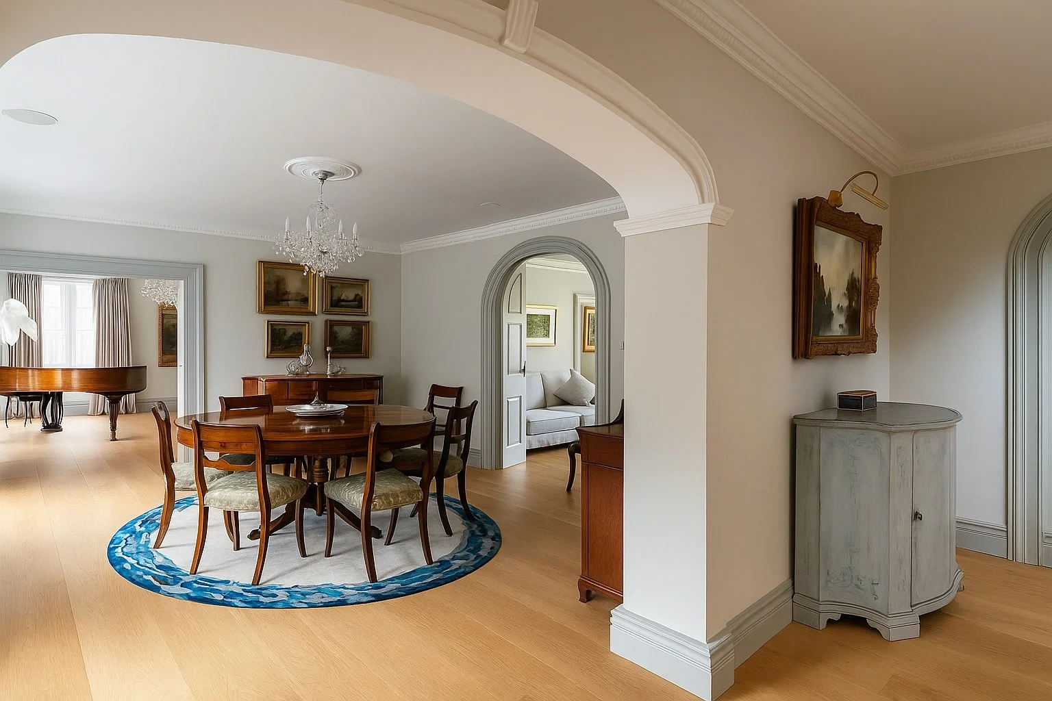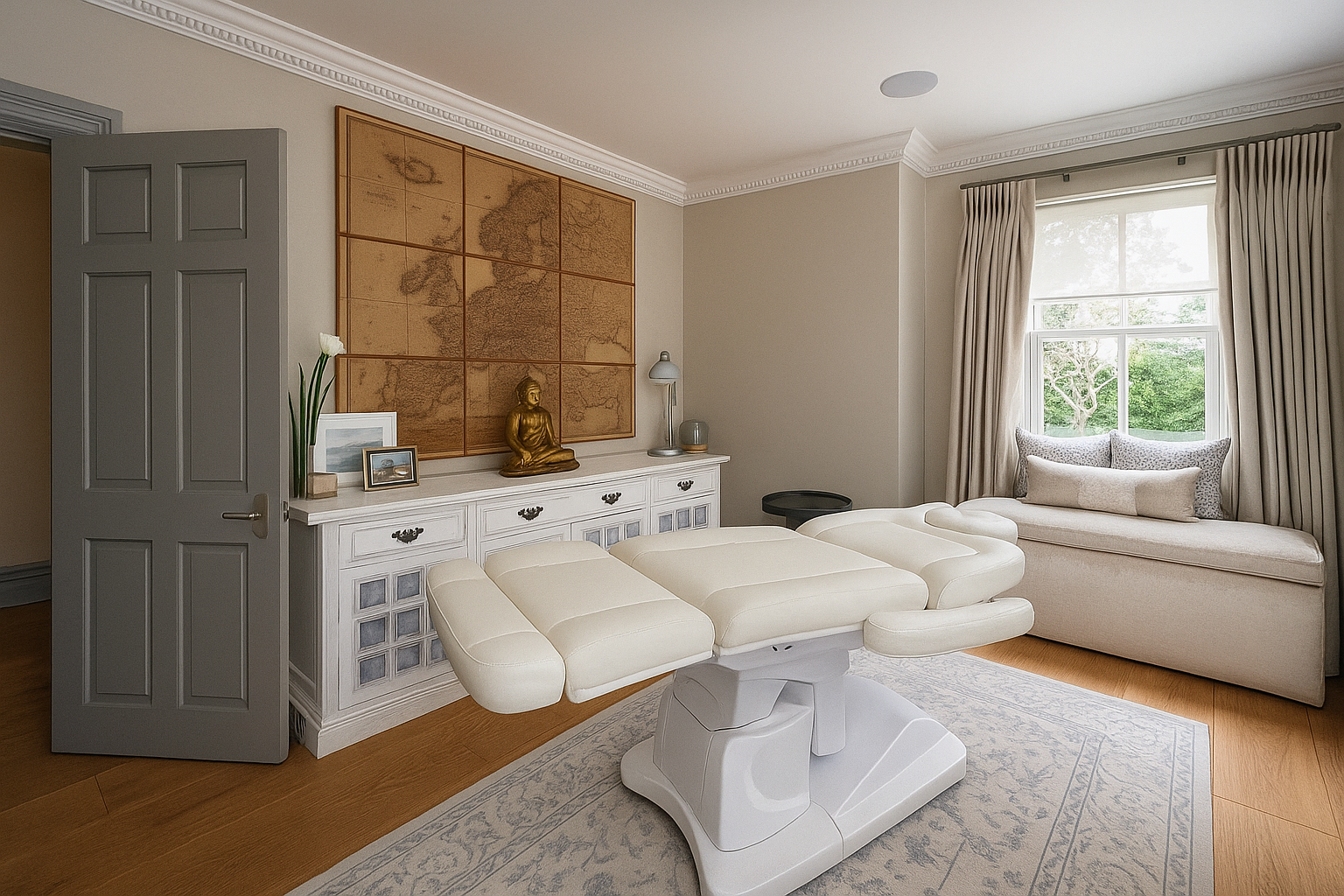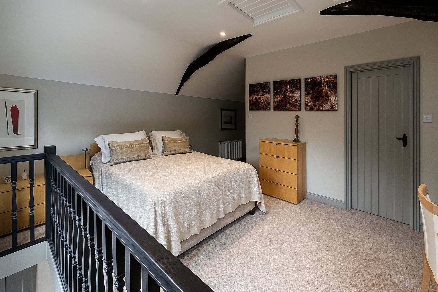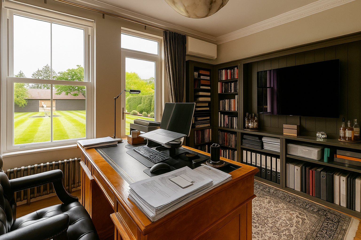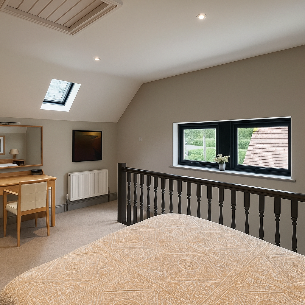 The Moat House is a comprehensively redeveloped country residence set within a tranquil, moated site, designed to accommodate both family life and leisure. The main house has been extensively remodelled, introducing a dramatic double-height entrance, an open-plan kitchen and dining space, and reconfigured private areas finished to a high specification. Outbuildings, once housing stables and staff facilities, have been transformed into a leisure complex featuring a music studio, wine cellar, cycle garage, virtual golf range, yoga space, and a covered pool with an outdoor kitchen.